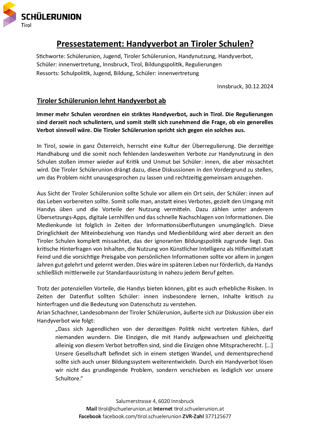 Immer mehr Schulen verordnen ein striktes Handyverbot, auch in Tirol. Die Regulierungen sind derzeit noch schulintern, und somit stellt sich zunehmend die Frage, ob ein generelles Verbot sinnvoll wäre. Die Tiroler Schülerunion spricht sich gegen ein solches aus.