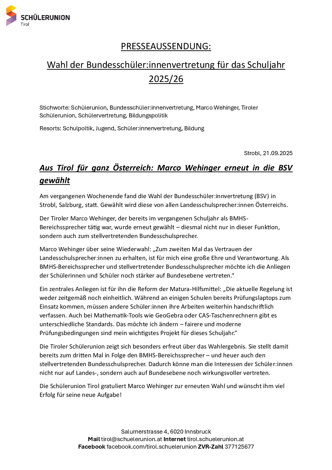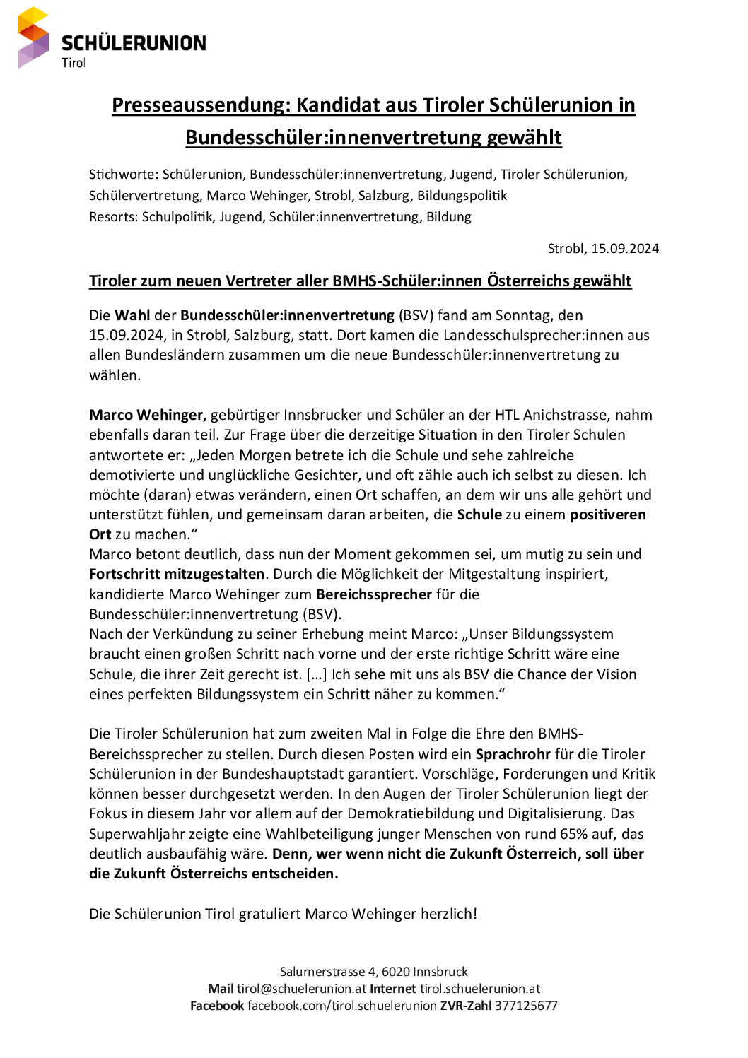 Die Wahl der Bundesschüler:innenvertretung (BSV) fand am Sonntag, den 15.09.2024, in Strobl, Salzburg, statt. Dort kamen die Landesschulsprecher:innen aus allen Bundesländern zusammen um die neue Bundesschüler:innenvertretung zu wählen. Der Kandidat der Tiroler Schülerunion, Marco Wehinger, wurde dabei zum BMHS-Bereichssprecher gewählt. Wir gratulieren Marco zu seiner neue Aufgabe in der BSV.