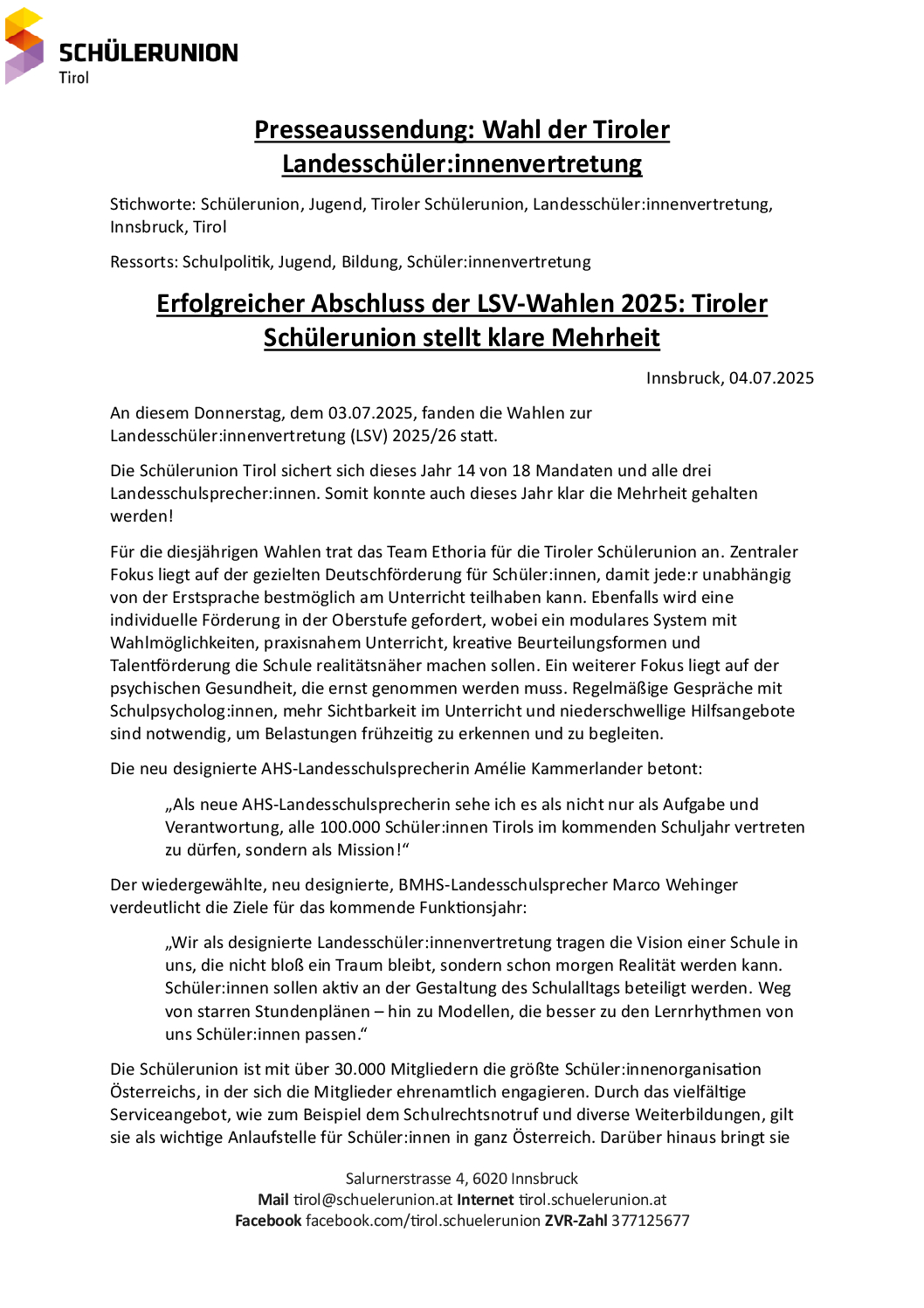 Erfolgreicher Abschluss der LSV-Wahlen 2025: Tiroler Schülerunion stellt klare Mehrheit