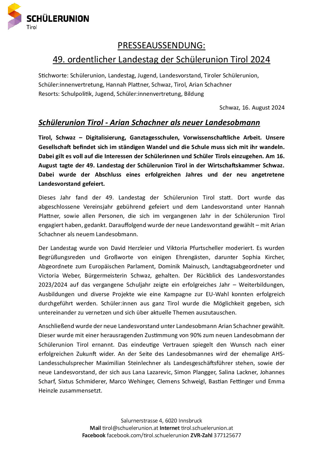 Tirol, Innsbruck- In unserer schnelllebigen Welt, in der sich alles innerhalb weniger Sekunden verändert, bleibt unser Bildungssystem oftmals eingerostet. Deshalb braucht es jemanden, auf den sich die Tiroler Schüler:innen verlassen können. Und dafür setzt sich die Schülerunion Tirol schon lange ein. Am 29. August tagte der 50. Landestag der Schülerunion Tirol in der SoWi Innsbruck.