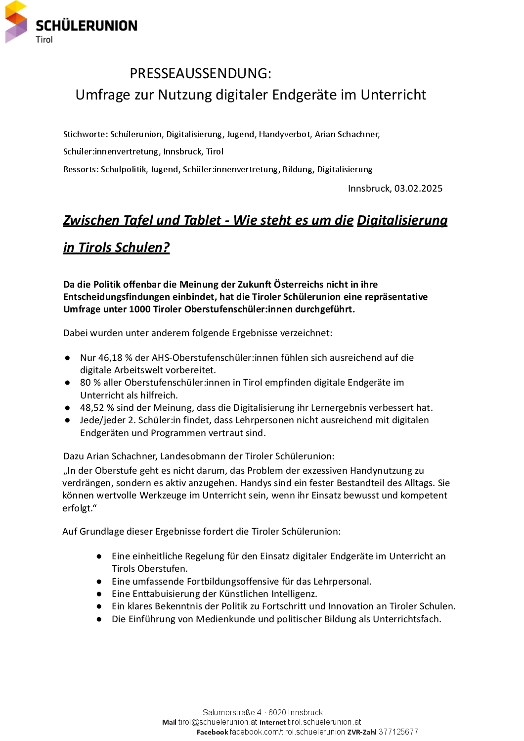 Da die Politik offenbar die Meinung der Zukunft Österreichs nicht in ihre Entscheidungsfindungen einbindet, hat die Tiroler Schülerunion eine repräsentative Umfrage unter 1000 Tiroler Oberstufenschüler:innen durchgeführt.