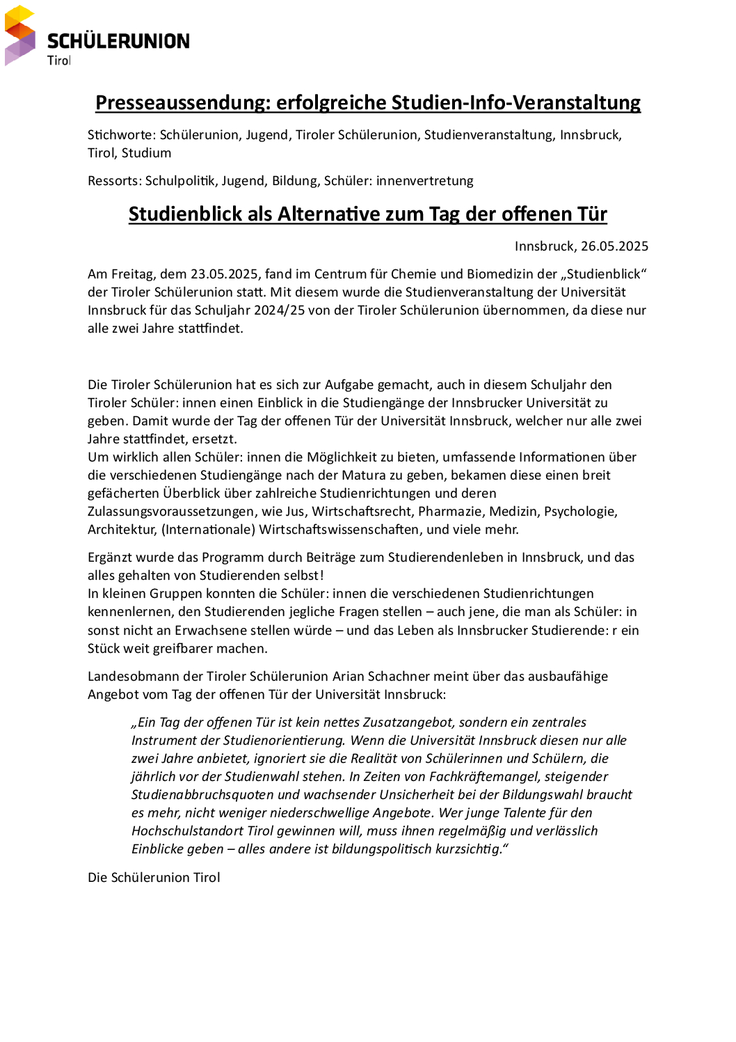 Am Freitag, dem 23.05.2025, fand im Centrum für Chemie und Biomedizin der „Studienblick“ der Tiroler Schülerunion statt. Mit diesem wurde die Studienveranstaltung der Universität Innsbruck für das Schuljahr 2024/25 von der Tiroler Schülerunion übernommen, da diese nur alle zwei Jahre stattfindet.