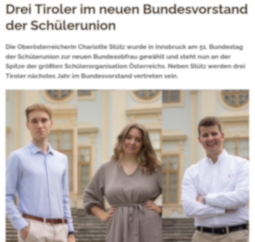 Die Oberösterreicherin Charlotte Stütz wurde in Innsbruck am 51. Bundestag der Schülerunion zur neuen Bundesobfrau gewählt und steht nun an der Spitze der größten Schülerorganisation Österreichs. Neben Stütz werden drei Tiroler nächstes Jahr im Bundesvorstand vertreten sein.